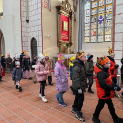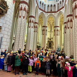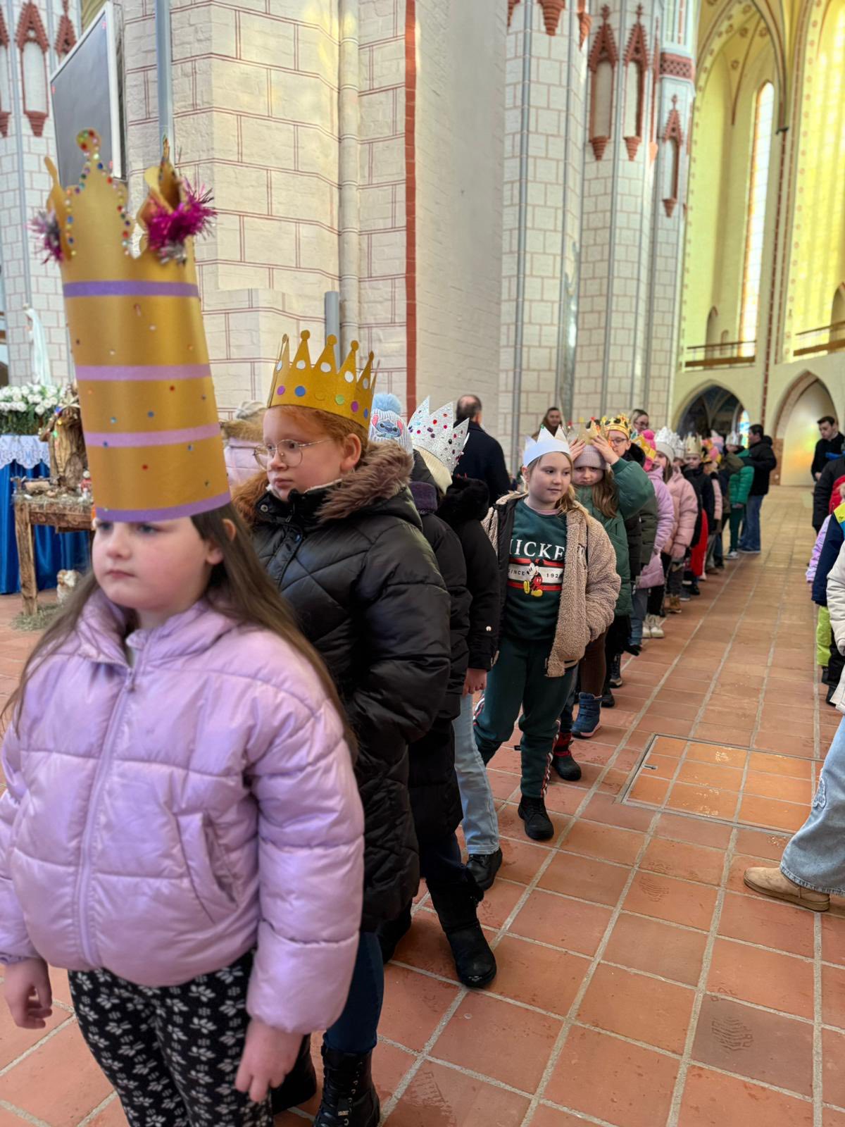 O godzinie 12.00 dzieci przyszły z własnoręcznie wykonanymi koronami, aby przejść w procesji do betlejemskiego żłobka i pokłonić się Nowonarodzonemu, Chrystusowi. Korony na głowach dzieci wyglądały przepięknie. Widać ogromy trud i pracę także rodziców.